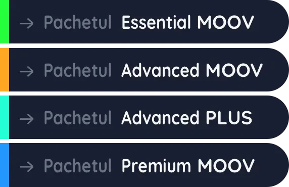 Pachetele de servicii MOOV sunt flexibile și includ doar acele lucruri de care ai nevoie. În prezent vă punem la dispoziție 4 pachete din care puteți alege: Essential MOOV Advanced MOOV Advanced Plus Premium MOOV.